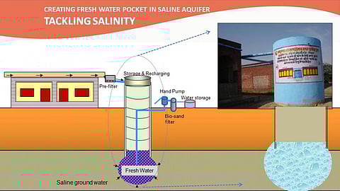 This is achieved by recharging collected rooftop rainwater below the water table, with gravity-induced hydrostatic pressure. For this, the recharge well is sunk to a depth lower than the existing groundwater level and raised to an above ground height to gain additional hydrostatic pressure in shallow aquifer conditions. As rainwater enters this well, due to hydrostatic pressure rain water pushes the existing saline water aside and forms a pocket of freshwater within the saline aquifer. Later, this sweet water is extracted with a hand pump. The water passes through a biosand filter that removes physical, suspended, and biological contaminants and is accessed through water taps at the school. The model is environment friendly as the system requires no use of chemicals or energy.