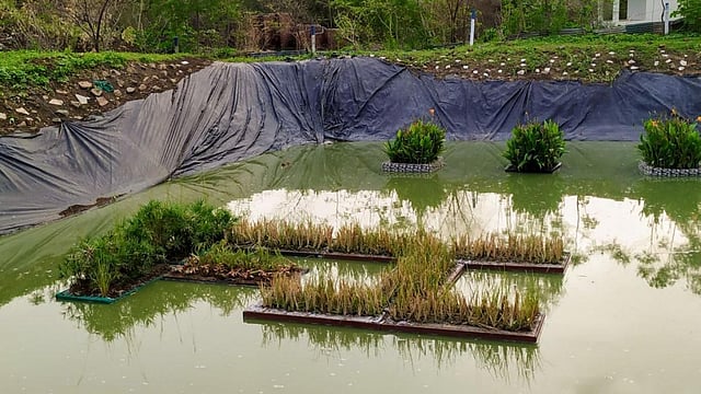 One after another, Clean Water planted 12 floating islands of four varieties on the pond and planted wetland plants such as canna, vetiver grass and umbrella palm. As the plants grow, their roots extend beneath the island into the water. It was soon realized that there was a lot of sludge deposited in the bottom of the pond, which had to be removed before the onset ofthe monsoons.