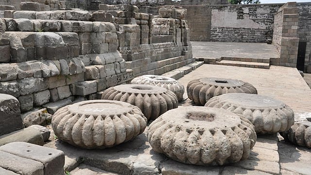 The steps that lead up to the fort have well-cut channels running along their side that directed rainwater to collection tanks. Stepping amongst the ruins, one can still see crumbling tanks with cut out steps reaching to the bottom. Once a celebrated palace, the stone pillars and ruins at the top of the hill boast of an open water tank, smack in the centre of the coutyard. Even the path up the fort is interspersed with wells, now covered and padlocked but still brimming with water.
