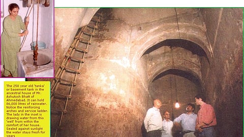 Around 10,000 houses in the city of Ahmedabad have large underground tanks or 'taankaas' that can each store 25,000 litres of rainwater. These serve as mini reservoirs for families during water scarcity. When tested for quality, they have proven to meet WHO norms.