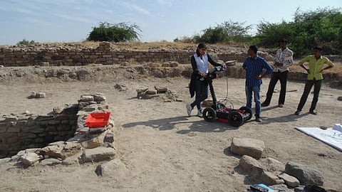 A team of archaeologists at the Indian Institute of Technology, Gandhinagar, conducted a survey of an unexplored area of around 12,276 square metre at Dholavira using Ground Penetrating Radar (GPR) technique which helps to scan the ground and reveal objects buried underground.